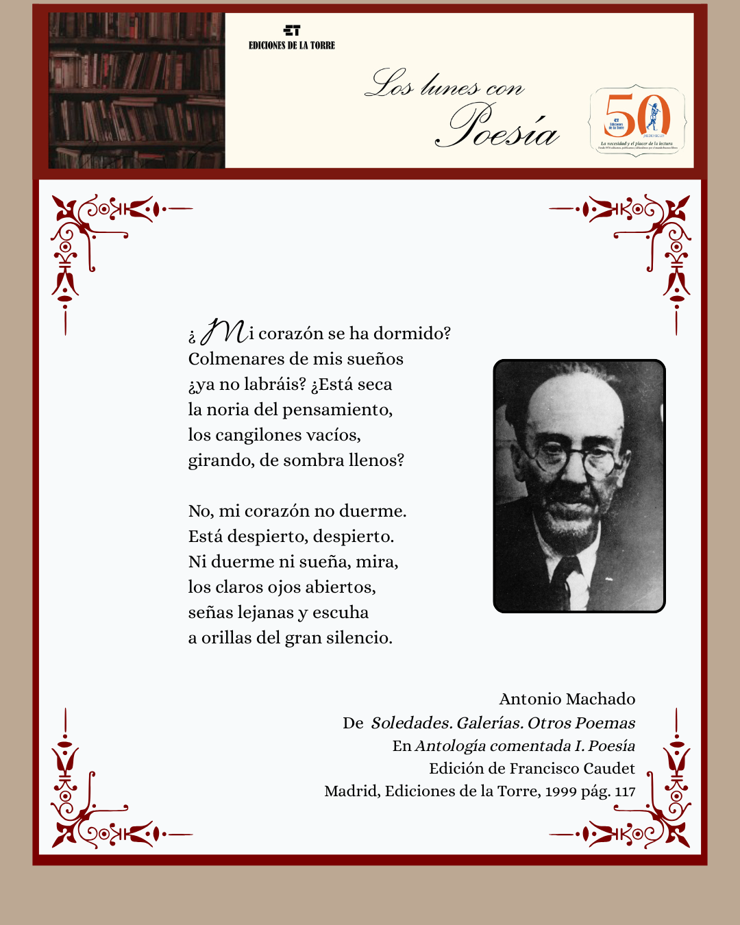 Ayer, 22 de febrero, se conmemoraba el 87.º aniversario de la muerte (en Colliure, Francia) de Antonio Machado. Hoy lo recordamos leyendo sus versos, que siguen más vivos que nunca.